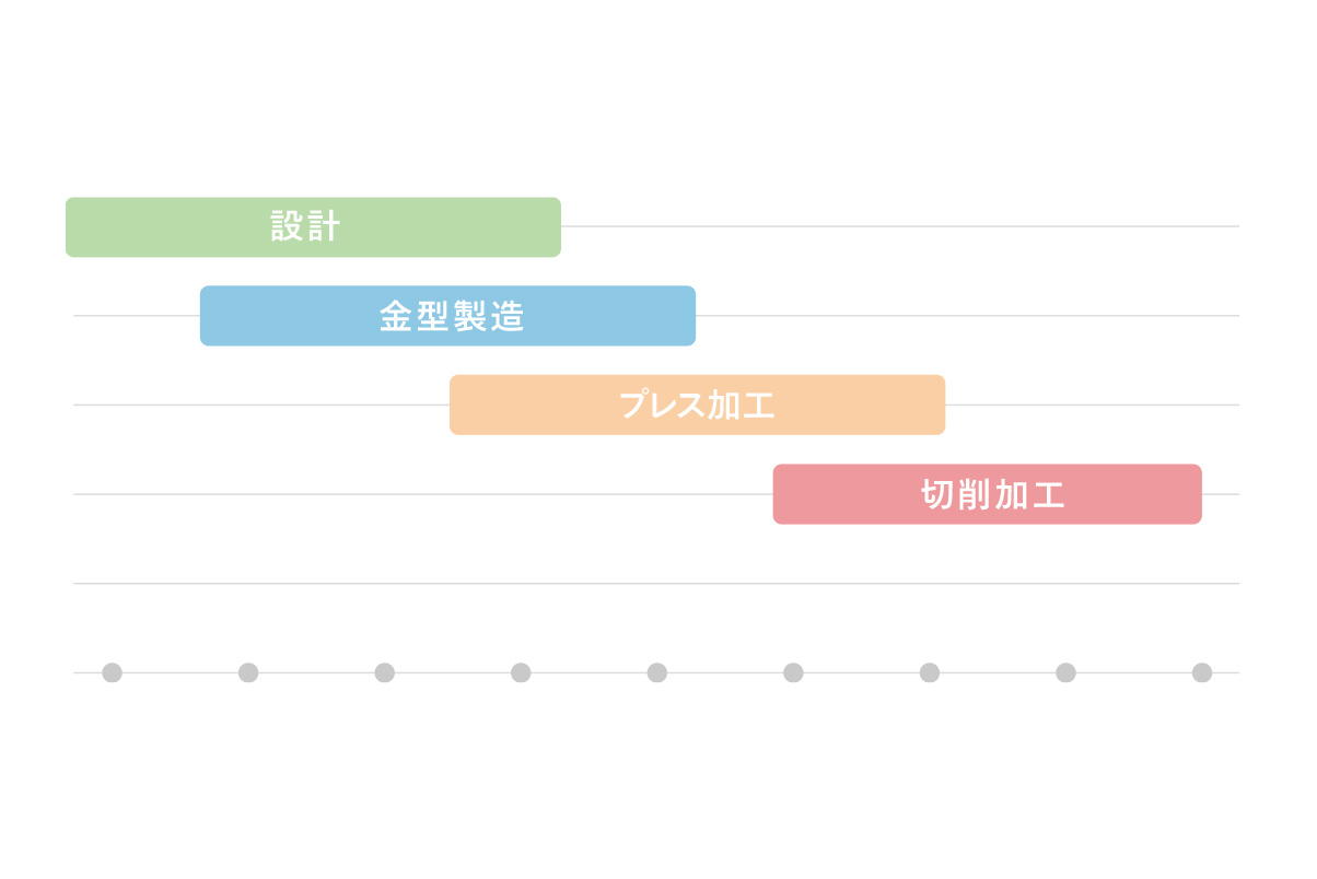 製作作業に入る前に、各課責任者が集まり新型設計の打ち合わせのみ会議致します。それぞれの課の特徴やそのときどきの状況を理解することで、スムーズな計画を設定していきます。その後は独自のオンライン生産管理システムに各責任者が予定を入力、全課 無駄のない予定にて全機械フル稼働させています。