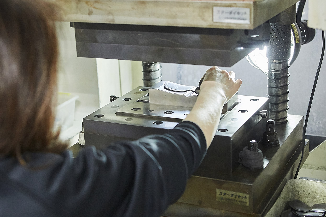 プレス加工とは、材料に圧力をくわえて、圧縮や切断、曲げやトリミングなどをおこなう作業です。寸法精度の高い冷間鍛造を採用し、チタン素材に対して、最小3トンから最大300トンもの力を使いプレスを行います。