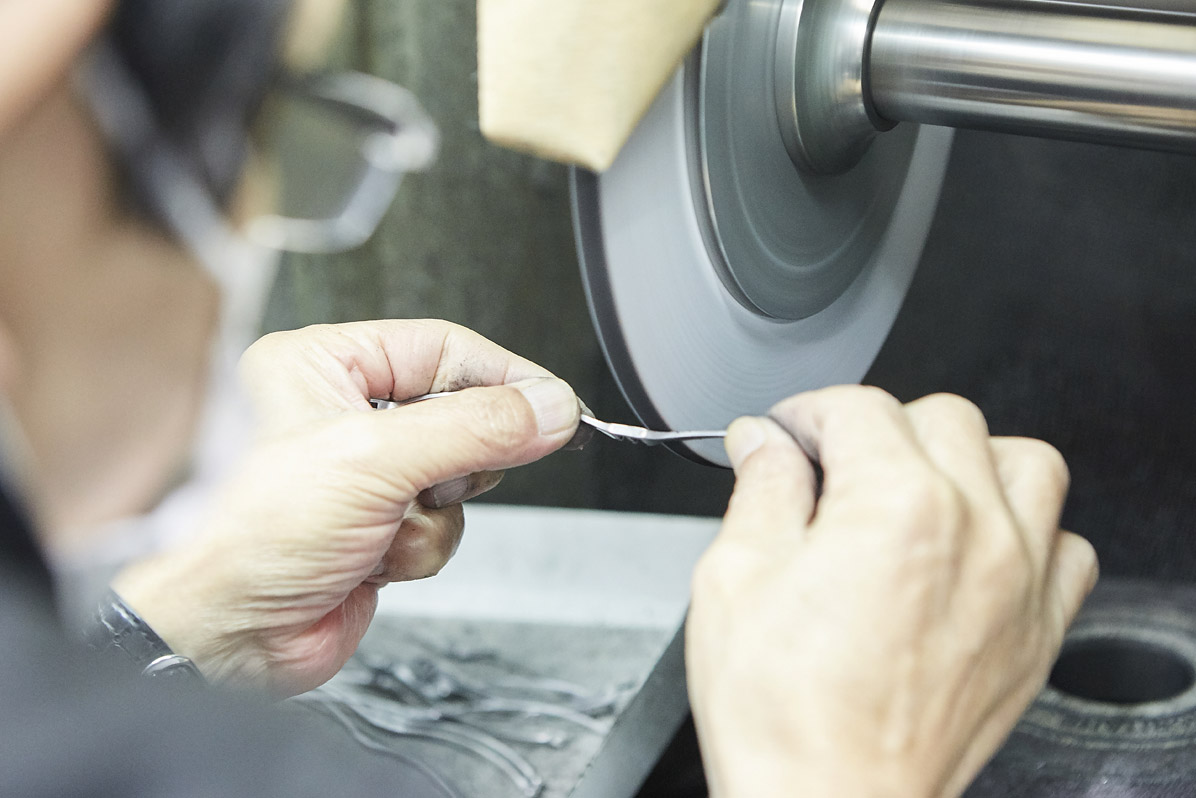 手作業で行うバフ研磨。最終的な仕上げには、今も職人の手に伝わる伝統的な技術が使われています。